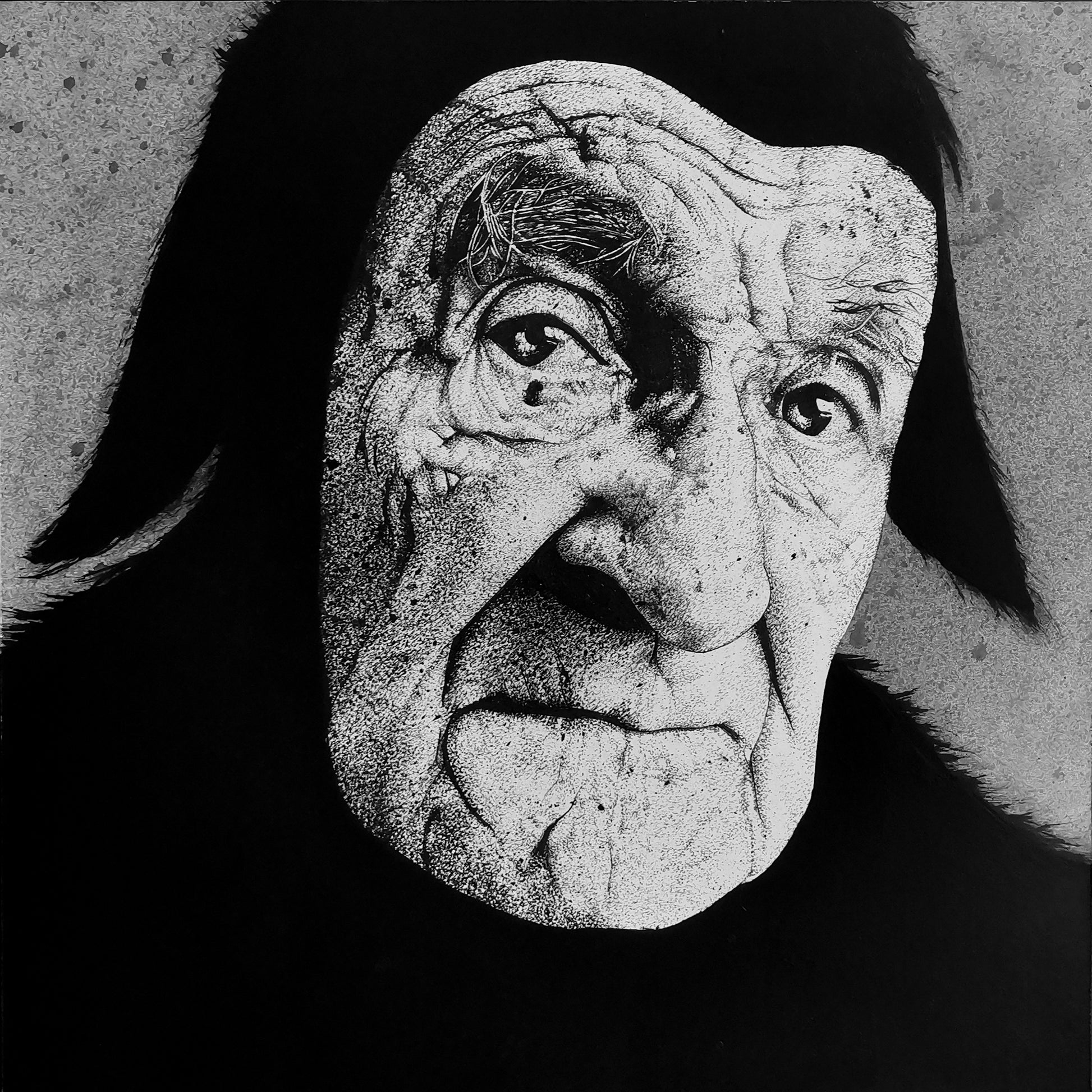 Ink and liquid acrylic on cotton paper mounted on a tamboured wooden panel.